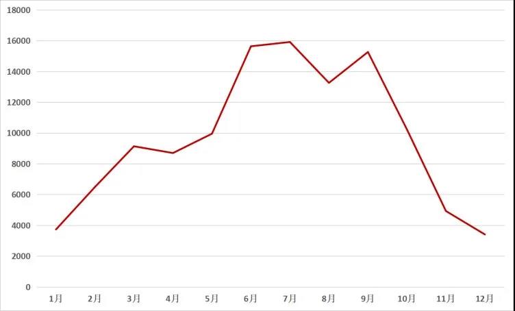 花生作為油料作物,近年來種植面積呈現穩定增長的發展趨勢,據行業數據顯示,2020年全國花生總種植面積為7560萬畝,較上年的7166萬畝增加5.50%,我們從用戶對花生收獲機的關注度人數不難看出,在所有農機品類都下滑的情況下,花生收獲機卻依然呈現增長態勢,農機通網用戶訪問對花生收獲機的訪問量從2019年10.9萬增長至2020年11.7萬,同比2019年,增長6%。從2020年花生收獲機關注度月度走勢圖來看,在6-10月的花生收獲季節,關注的用戶較多。